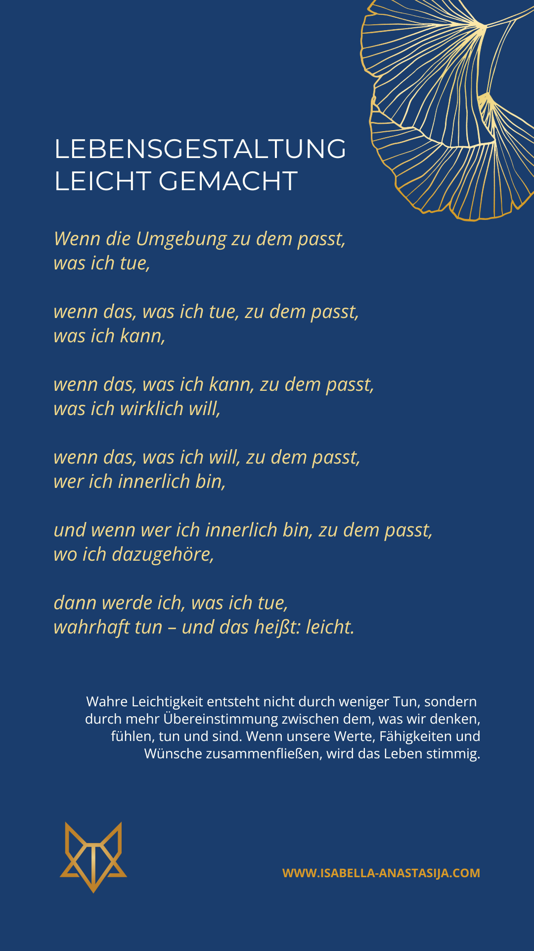 Nimm dir einen Moment Zeit, um nachzuspüren, was dich trägt, was dich leitet und wohin du wachsen möchtest. Vielleicht erkennst du dabei, dass Leichtigkeit entsteht, wenn deine Stärken, Werte und Wünsche im Einklang sind, wie ein innerer Baum, der fest verwurzelt dem Licht entgegenwächst.